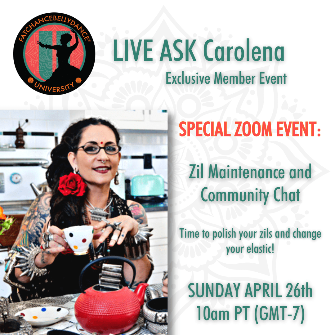 𝗔 SPECIAL Member 𝗲𝘅𝗰𝗹𝘂𝘀𝗶𝘃𝗲 𝗲𝘃𝗲𝗻𝘁: This month we invite you to bring your zils, polishing cloth, and fresh elastic! We'll meet via Zoom for a special community craft session and chat with Carolena! Bring your zils, bring your questions! 𝗟𝗜𝗩𝗘, 𝗠𝗼𝗻𝘁𝗵𝗹𝘆 𝗤&𝗔 𝗦𝗲𝘀𝘀𝗶𝗼𝗻 𝘄𝗶𝘁𝗵 𝘁𝗵𝗲 𝗰𝗿𝗲𝗮𝘁𝗼𝗿 𝗼𝗳 𝗙𝗮𝘁𝗖𝗵𝗮𝗻𝗰𝗲𝗕𝗲𝗹𝗹𝘆𝗱𝗮𝗻𝗰𝗲® 𝗦𝘁𝘆𝗹𝗲 to answer all your questions regarding the […]